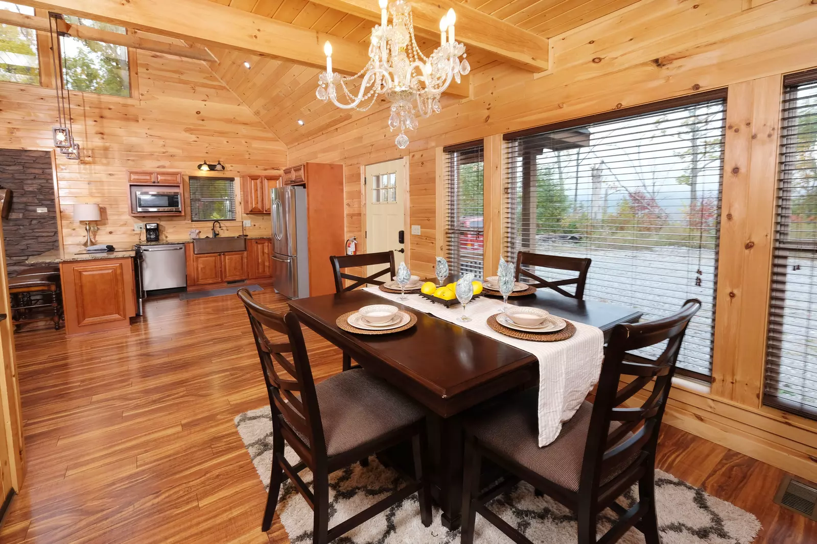 With such a well-equipped kitchen in the cabin, a great dining space is a must. Sit down for peaceful meals in the comfort of your own cabin in the dining room of Swept Away. A dark wood table with seating for 4 sits beneath a romantic chandelier, with a soft rug underfoot. Have a candlelit dinner or invite a couple friends for an intimate dinner party – with mountain views through the windows. In its own alcove, it’s a lovely spot for a quiet meal.
