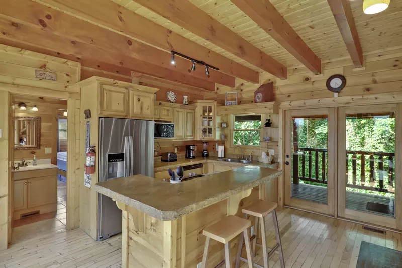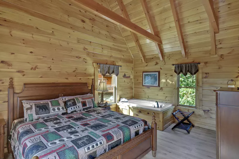 As you make your way to one of two bedrooms on the upper level, you'll have an excellent view of the mountains through the panoramic windows on the front of the cabin. The first bedroom has a rustic king-sized bed while the second bedroom provides yet another in-room jacuzzi tub. A jack-and-jill bathroom adjoins the sleeping quarters. A new full-sized futon on this level provides additional loft-like resting space when not taking in a wonderful view of the Smokies. Both rooms come equipped with flat-screen smart TVs.