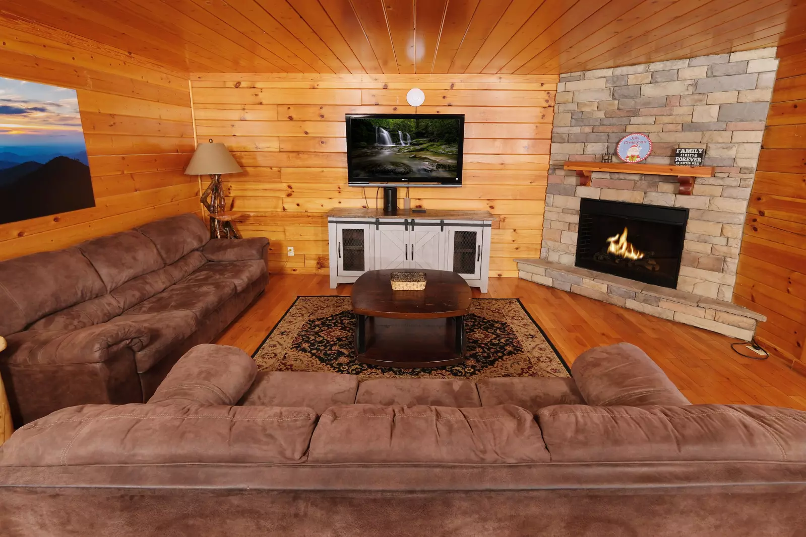 The main level features a cozy living area with plush leather seating, elegant decor, a flat-screen television, a stone accented electric fireplace, and a wall of windows that frame the expansive mountains. The third floor features an additional living area that offers impeccable views, a futon, an electric fireplace, flat-screen television, and a nearby card table. Each living area offers deck access for the family to embrace all the beautiful sights and sounds found in the mountains as they relax in the hot tubs or on the variety of seating options offered on each deck.